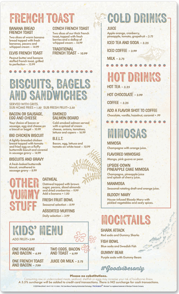 Open daily – 7 AM – 9 PMBreakfast – 7 AM – 11 AM1870 North Waccamaw DriveGarden City, SC, 29576